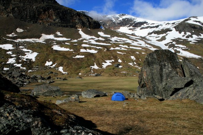 Liikkeelle lähdettiin Abiskosta Kungsledeniä aluksi seuraillen. Noin kolmen kilometrin jälkeen poikettiin reitiltä suuntaan Ballinvaggi tavoitteena Ballinjohkan varrella sijaitseva ”tältlägret”. Tällä paikalla oli jäänteitä vanhasta leiristä. Kodan rauniot ja ränsistynyt lipputankokin oli vielä pystyssä.
