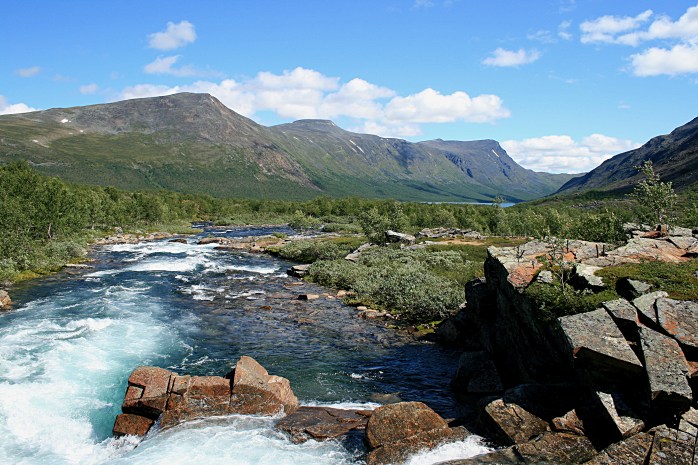 Tuon tasannevaiheen jälkeen polku laskeutui Kaitumjåkkan varteen, josta vähitellen avautui hienot näkymät kohti Kaitumjärveä. Kaitumjauren tuvilla haettiin sitten hieman täydennystä muonavarastoihin.