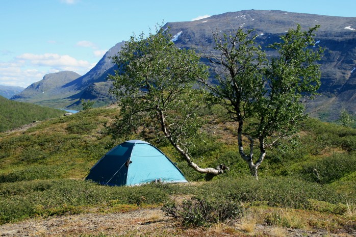 Tämän nyt kulkemamme reitin varrella on kaksi paikkaa, jossa siihen mahdollisuus. Toinen tuo Kaitumjaure ja toinen tietysti Kebnekaise Fjällstation. Majoilta vähän matkaa pohjoiseen jyrkähköstä rinteestä löytyi sen verran tasanteita, että teltat saatiin pystytettyä. Illan menu oli perunamuusi ja jauhelihakastike, jonka raaka-aineena käytettiin itse kuivattua jauhelihaa. Hyvältä maistui.
