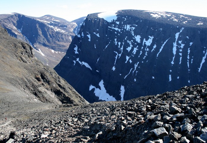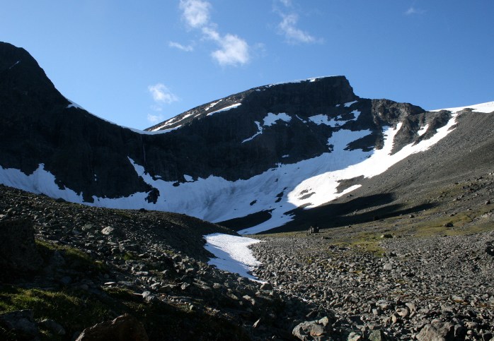 Huiputukselle lähdettiin helpompaa ja pitempää ns. turistireittiä eli Västra Ledeniä pitkin. Toinen vaihtoehto olisi ollut Östra Leden. Se on vaativampi kiipeilyosuuksia sisältävä reitti. Ensimmäinen nousuosuus oli jyrkähköä nousua pitkin Kitteldalen laaksoa. Yläosassa laaksoa kasvillisuus loppui. Alkoi kivirakka, jota sitten riitti koko loppumatkalle. Kitteldalen laakson ylöosassa käännyttiin vasemmalle Kittelbäck ylittäen. Karttaan merkittyä siltaa ei enään tuolla ollut. Lyhyen etsiskelyn jälkeen joen ylityspaikka löytyi kuitenkin helposti.