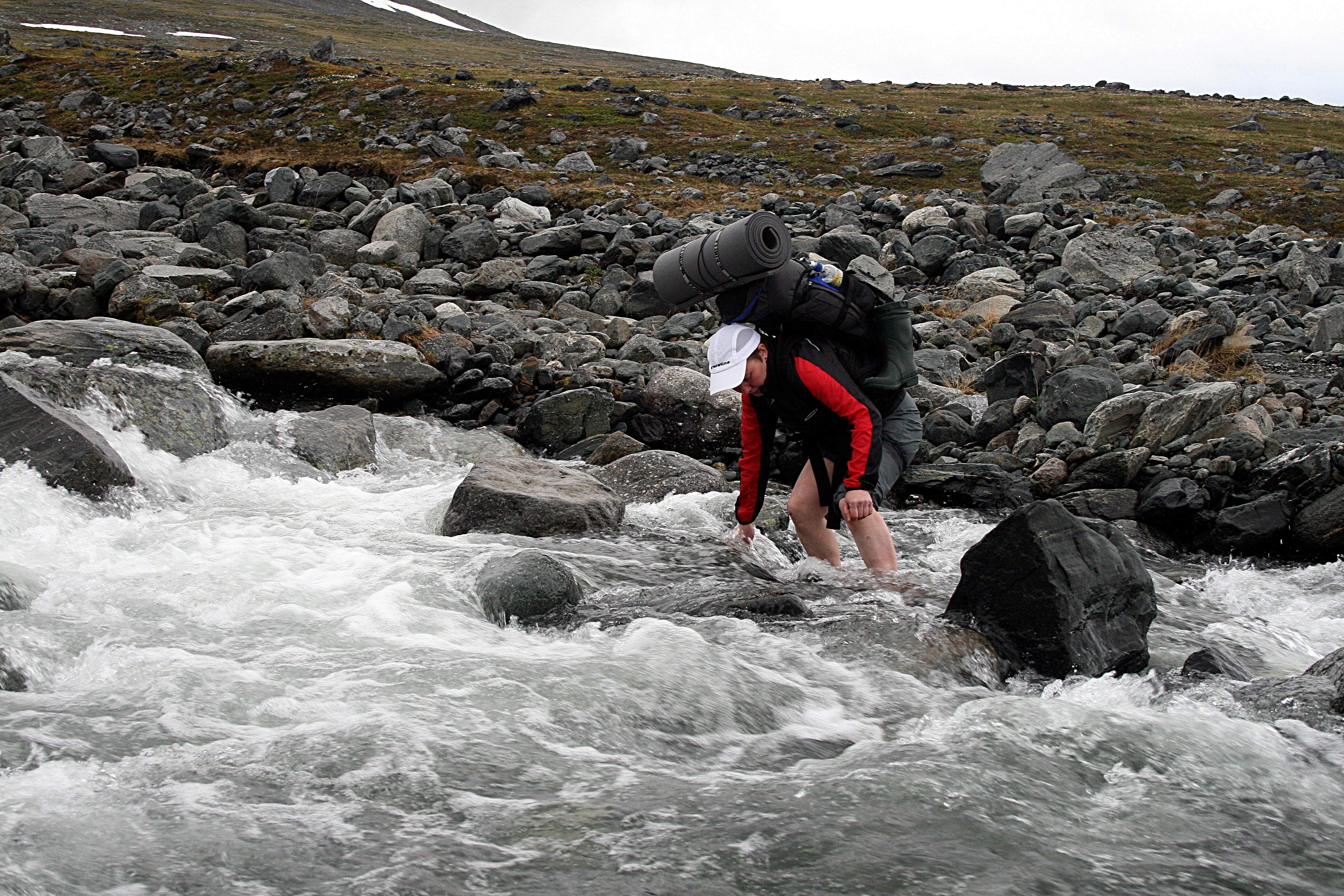 Ainut vaihtoehto oli ylitys kahlaamalla. Pienen etsiskelyn jälkeen löytyi paikka, mistä voisi yrittää ylitystä kahlaamalla. Vesi oli todella kylmää ja virta voimakas.