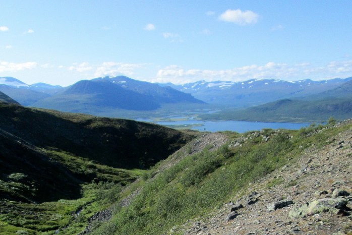 Alkumatkasta reitti kulki muutaman suon yli. Hilloja soilla oli ihan syötäväksi asti. Parin tunnin taivalluksen jälkeen tultiin Tjuonajåkkaan johtavalle reitille. Polku nousi vähitellen ylemmäs avonaisempiin maisemiin ja päästiin eroon häiritsevistä itikoista. Ensimmäinen leiri pystytettiin Borrasgorsaan pienen puron varrelle.