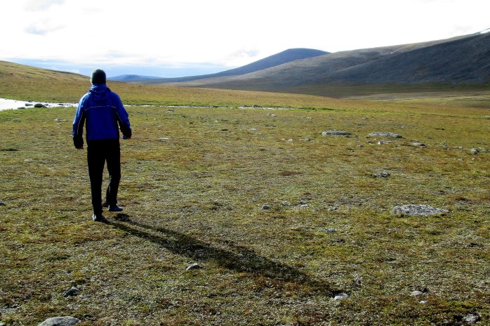 Borrasgorsaa jatkettiin ylemmäs ensimmäiseltä yöpymispaikalta noin tunnin verran, jonka jälkeen suunnattin länteen Larkinlahkua kohti. Ja edelleen upeassa avarassa näköalapaikassa sijaitsevalle poromiesten tuvalle. Lounaassa erottuivat Urtticohkkan (1463 mpy) ja Ceabetcohkkan (1386 mpy) huiput.