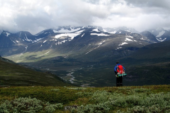 Hienoinen vesisade jatkui aamuyöhön. Aamulla sää oli muuttunut selkeäksi ja nyt avautui huikeat näkymät Kebnekaisen suuntaan. Täältä suunnalta katsottuna näkee koko Kebnekaisen massiivin suuruuden. Huippuja ja jäätiköitä vieri vieressä.