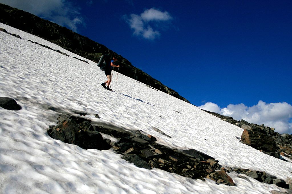 Aamulla jatkettiin kapuamista ylemmäs edelleen Ballinvaggia seuraten. Noin 1000 metrin korkeudella suunnattiin itään Pallentjåkkan paikoin lumista pohjoisrinnettä pitkin kohti Nissonvaggia. Hetki harkittiin Pallentjåkkan huiputtamista, mutta ajatuksesta päätettiin tällä kertaa luopua.